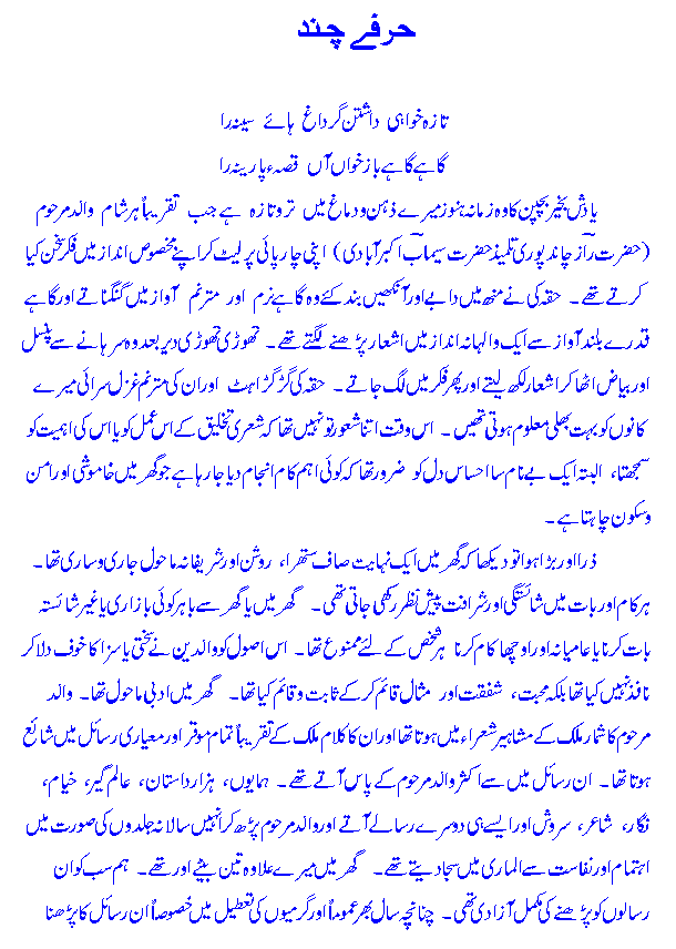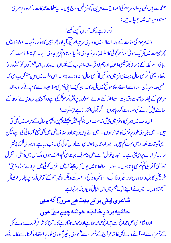 maiN is bazm meN aap kaa Khair-maqdam kartaa hooN. maiN bunyaadee t^aur par Ghazal kaa shaai'r hooN. naz^meN maiN ne bohat hee kam kahee haiN. Ghazal meN maiN puraane asaatiZah kaa muqallid hooN aur aap mere Khayaalaat, zabaan aur andaaz-e-bayaan meN rivaayatee Ghazal kaa a'ks meHsoos kareN ge. jaisaa keh maiN ne Khud kahaa hai: