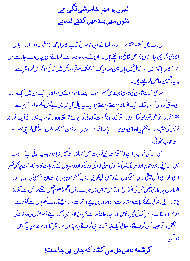 meree afsaanah-nigaaree kee taareeKh bohat muKhtaSar hai. kuch` hee a'rSah qabl ek risaale meN afsaane paRh`te huwe Khayaal aayaa keh kyoN nah maiN bh`ee is fan meN apnee qismat aazmaa,ooN! chunaan.ch apne Zaatee mushaahidaat aur tajribaat ko bunyaad banaa kar maiN ne afsaanoN kaa taanaa-baanaa bun,naa shuroo' kar diyaa aur nateejah aap ke saamne hai! in afsaanoN meN se har ek yaa to meree zindagee ke kisee Haadiceh se muta,a'lliq hai yaa kisee qareebee dost ke tajribe par mabnee hai. ummeed hai ke Haqeeqat-nigaaree ke aa,eenah-daar yeh afsaane aap ko pasand aaYeN ge. aap se iltimaas hai keh :KitaabeN: (Books) ke baab meN :Teesraa Haath: par likh`e gaYe deebaachoN ko paRh` leejiYe gaa taa.k in afsaanoN kaa pas-manz^ar aur takneek aap par mazeed z^aahir ho jaaYeN. shukriyah!