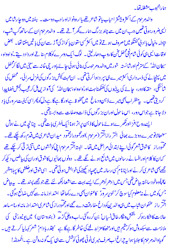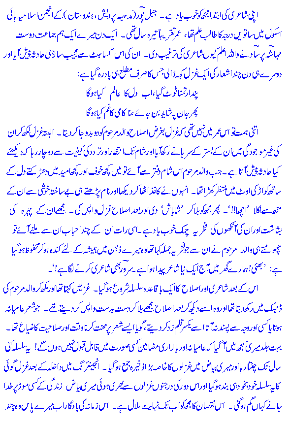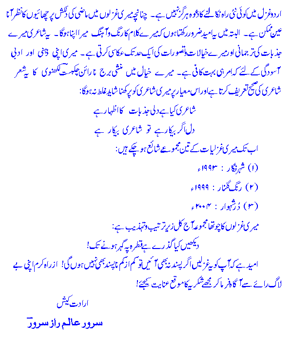 maiN is bazm meN aap kaa Khair-maqdam kartaa hooN. maiN bunyaadee t^aur par Ghazal kaa shaai'r hooN. naz^meN maiN ne bohat hee kam kahee haiN. Ghazal meN maiN puraane asaatiZah kaa muqallid hooN aur aap mere Khayaalaat, zabaan aur andaaz-e-bayaan meN rivaayatee Ghazal kaa a'ks meHsoos kareN ge. jaisaa keh maiN ne Khud kahaa hai: