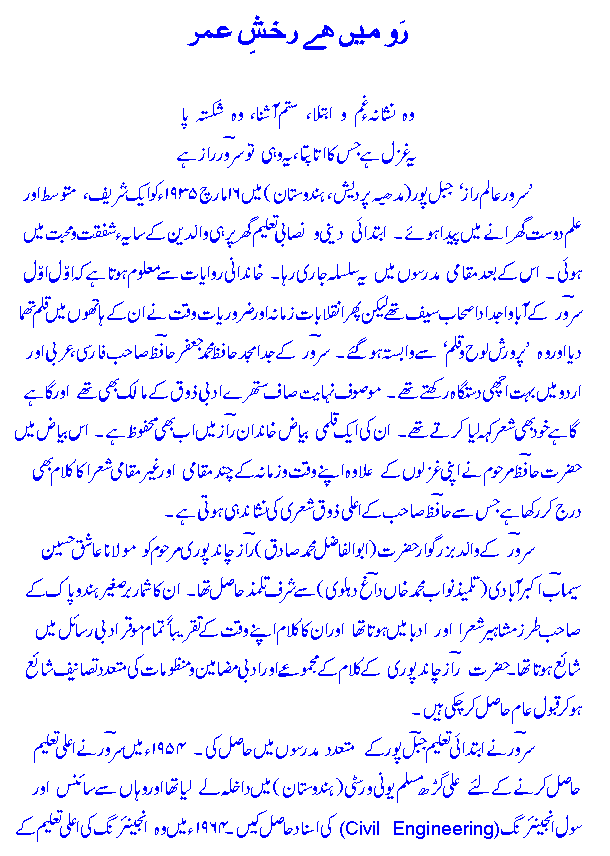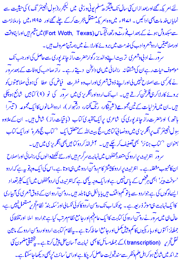 Sarwar is deeply involved in various Urdu literary activities on the Internet and devotes a large part of his time and energy to helping new and relatively inexperienced writers and poets improve and hone their skills. He has recently developed a comprehensive system of Roman Urdu (Urdu in Roman script) writing which takes into account almost all of the finer points, details and niceties of Urdu :imlaa and talaffuz: and is eminently suited to literary purposes.