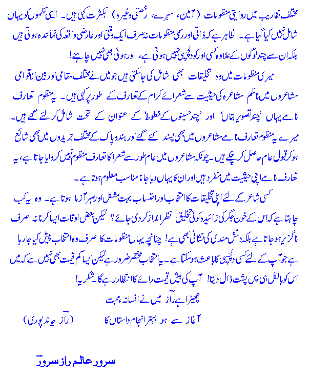 maiN nazm^ kam hee kehtaa hooN. mizaaja" maiN Ghazal kaa shaai'r hooN. agar kabh`ee koyee nazm kahee bh`ee hai to woh kisee waqtee jaZbeh ke teHt kahee hai. beshtar manz^oomaat Zaatee aur rasmee qism kee haiN, macala" woh tehnaiyyatee naz^meN jo maiN ne dostoN aur a'zeezoN kee farmaa,ish par kisee KhaaS samaajee mauqe' par kahee haiN. in meN woh manz^oom ta,a'arufee qit^a'at shaamil naheeN haiN jo maiN ne maqaamee mushaai'roN kee niz^aamat kee Zimmedaaree nibh`aatr huYe shoa'raa ko meHfil meN muta,a'arif karaane kee Kaat^ir kahe haiN. in ta,a'aruf-naamoN meN se bohat se Hind-o-Pak ke risaaloN meN shaa,e' ho chuke haiN.